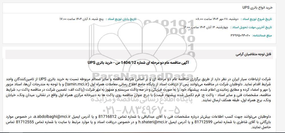 علاقه‌مندان می‌توانند جهت دریافت اسناد و اطلاعات تکمیلی، مناقصه عام خرید انواع باتری UPS با سامانه مناقصات و مزایدات ایران پارس‌نماد داده ها 88349670 تماس حاصل نمایند.