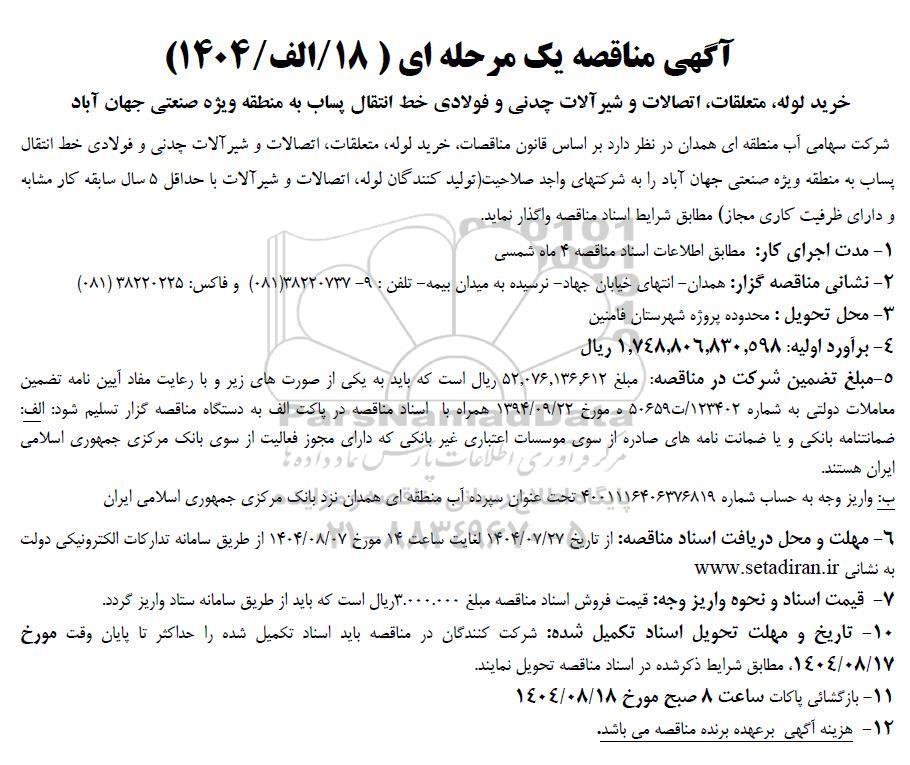 شرکت سهامی آب منطقه ای همدان در نظر دارد بر اساس قانون مناقصات، خرید لوله، متعلقات، اتصالات و شیرآلات چدنی و فولادی خط انتقال پساب به منطقه ویژه صنعتی جهان آباد را به شرکت های واجد صلاحیت (تولیدکنندگان لوله، اتصالات و شیرآلات با حداقل 5 سال سابقه کار مشابه و دارای ظرفیت کاری مجاز) مطابق شرایط اسناد مناقصه واگذار نماید.