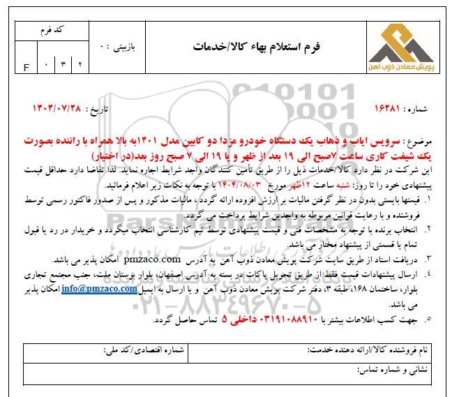 موضوع : سرویس ایاب و ذهاب یک دستگاه خودرو مزدا دو کابین مدل 1401 به بالا همراه با راننده بصورت یک شیفت کاری ساعت 7 صبح الی 19 بعدازظهر و یا 19 الی 7 صبح روز بعد (در اختیار)