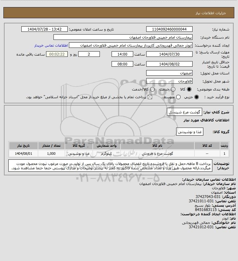 | 1 | -- | گوشت مرغ با افزودنی | کیلوگرم | غذا و نوشیدنی | 1,000 | 1404/08/01 |