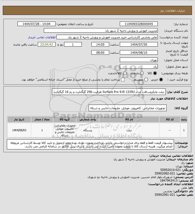 نام دستگاه خریدار:مدیریت اموزش و پرورش ناحیه 2 شهر ری