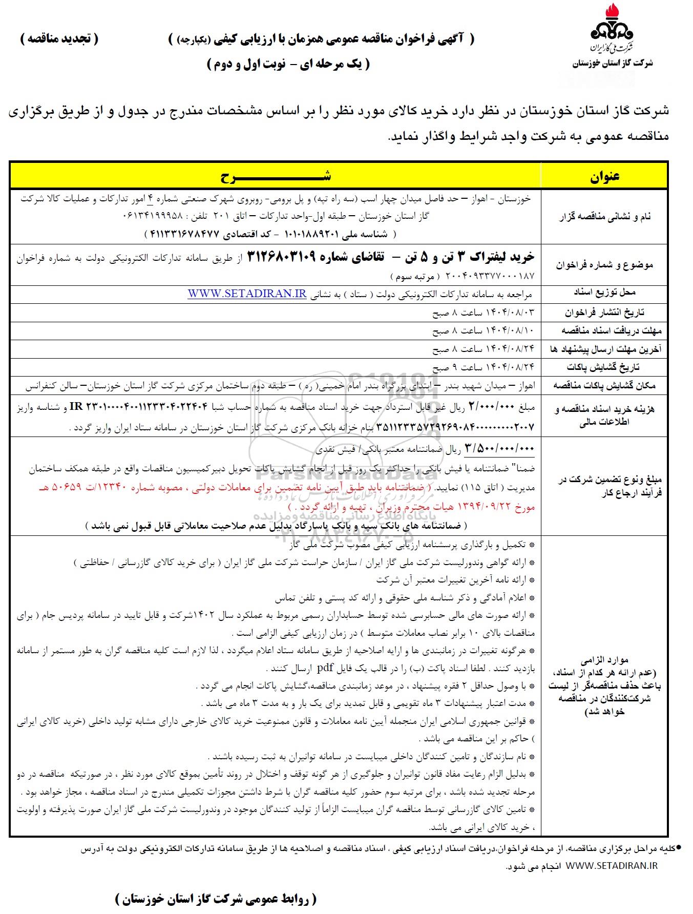 موضوع و شماره فراخوان: خرید لیفتراک 3 تن و 5 تن - تقاضای شماره 3126803109 از طریق سامانه تدارکات الکترونیکی دولت به شماره فراخوان 2004093377000187 (مرتبه سوم)