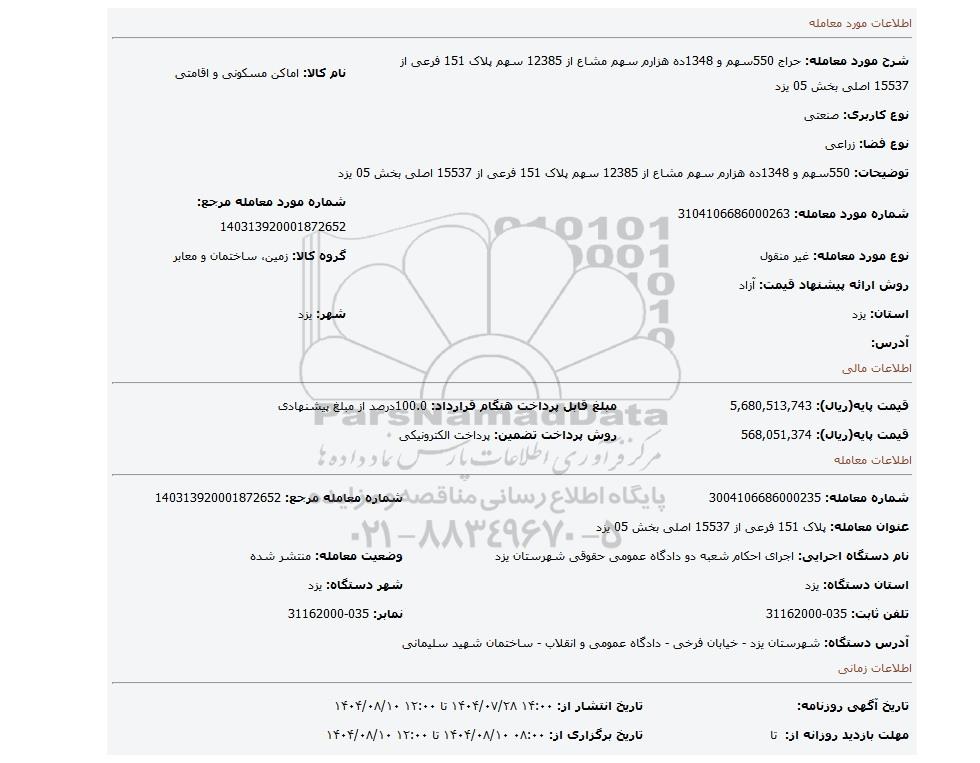 مزایده 550سهم و 1348ده هزارم سهم مشاع از 12385 سهم پلاک 151 فرعی از 15537 اصلی بخش 05 یزد, مزایده، 550سهم و 1348ده هزارم سهم مشاع از 12385 سهم پلاک 151 فرعی از 15537 اصلی بخش 05 یزد