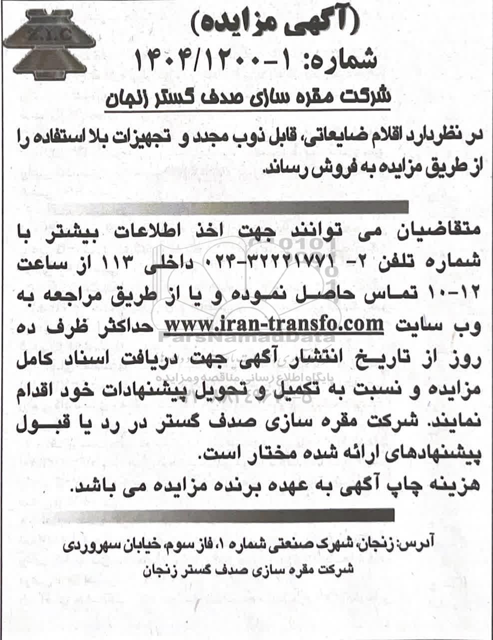 متقاضیان می توانند جهت اخذ اطلاعات بیشتر با شماره تلفن 2 - 32221771-024 داخلی 113 از ساعت 12 - 10 تماس حاصل نموده و یا از طریق مراجعه به وب سایت www.iran-transfo.com حداکثر ظرف ده روز از تاریخ انتشار آگهی جهت دریافت اسناد کامل مزایده و نسبت به تکمیل و تحویل پیشنهادات خود اقدام نمایند. شرکت مقره سازی صدف گستر در رد یا قبول پیشنهادهای ارائه شده مختار است.