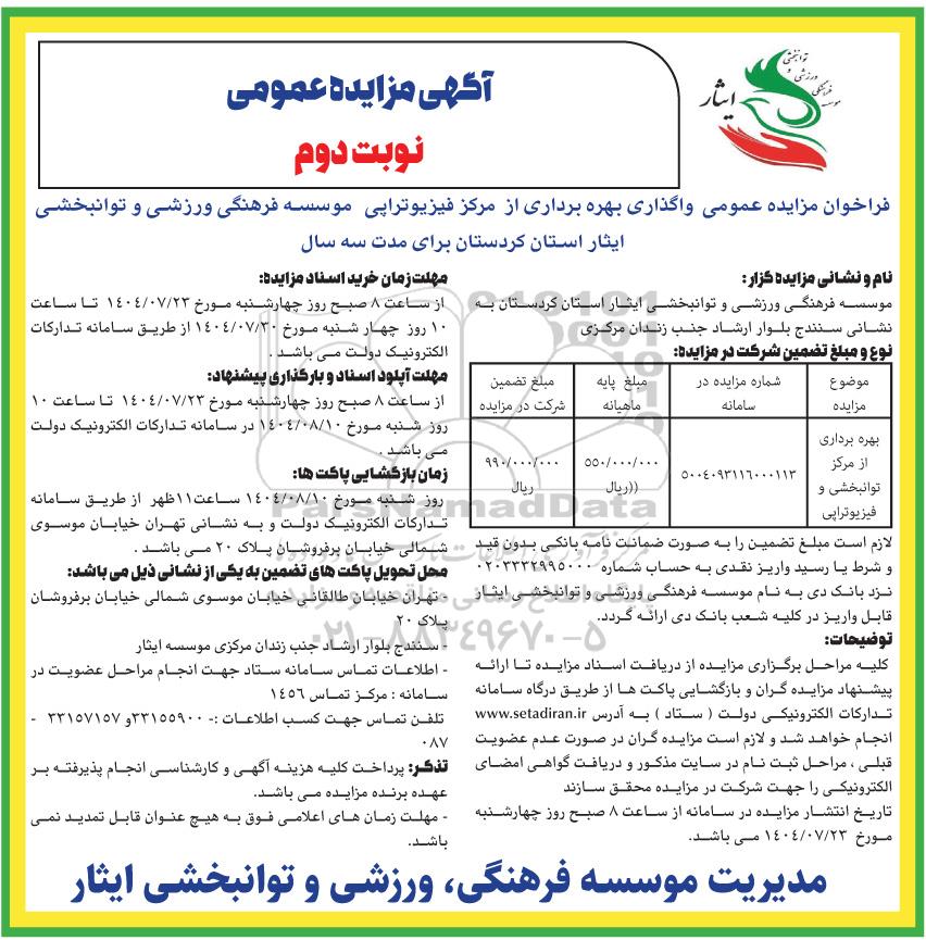 فراخوان مزایده عمومی واگذاری بهره برداری از مرکز فیزیوتراپی موسسه فرهنگی ورزشی و توانبخشی ایثار استان کردستان برای مدت 3 سال