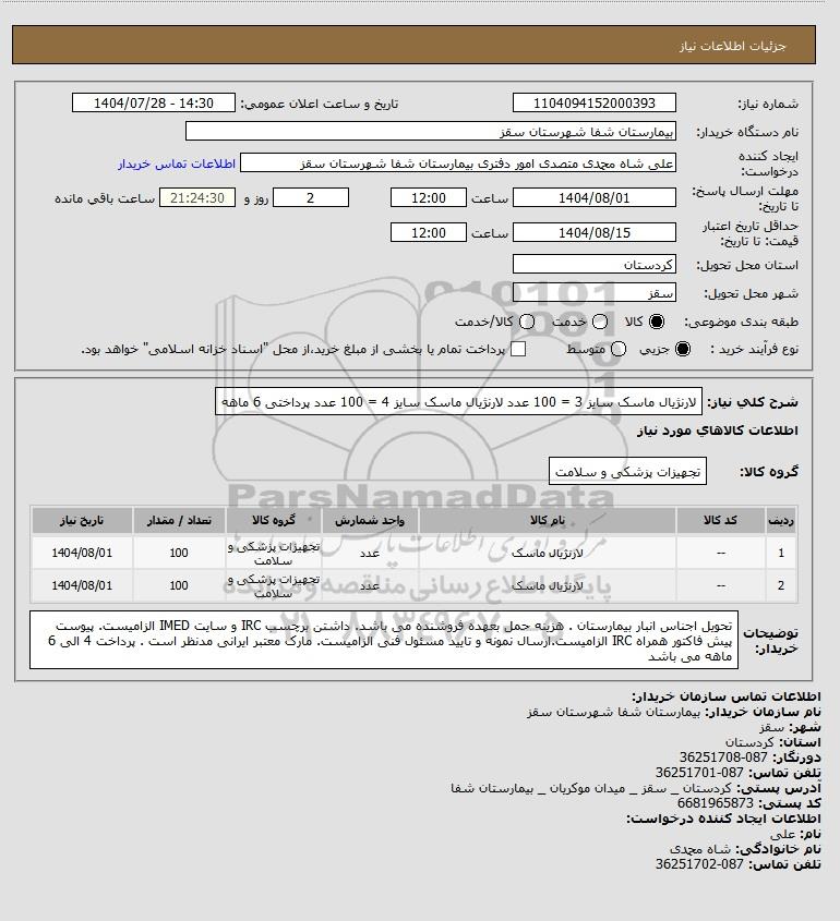 استعلام بها و موضوع استعلام استعلام لارنژیال ماسک سایز 3 = 100 عدد لارنژیال ماسک سایز 4 = 100 عدد پرداختی 6 ماهه به اطلاع کلیه شرکتها و افراد متخصص واجد شرایط میرساند، آگهی گذار در نظر دارد از طریق استعلام بها، نسبت به انتخاب و دریافت پیشنهادات اقدام نماید. این استعلام با کد آگهی ثبت شده در سامانه خبرگزاری پارس نماد : 9727170 منتشر شده است. مشخصات استعلام : تاریخ شروع استعلام: 1404/07/28 آخرین مهلت ارسال پیشنهاد قیمت : 1404/08/01 و محل اجرای پروژه : استان کردستان میباشد. استعلام قیمت مورد درخواست : استعلام لارنژیال ماسک سایز 3 = 100 عدد لارنژیال ماسک سایز 4 = 100 عدد پرداختی 6 ماهه با دستهبندیهای تخصصی و گروه های مرتبط : خدمات و تجهیزات آزمایشگاهی و پزشکی, استعلام اطلاع رسانی میگردد.