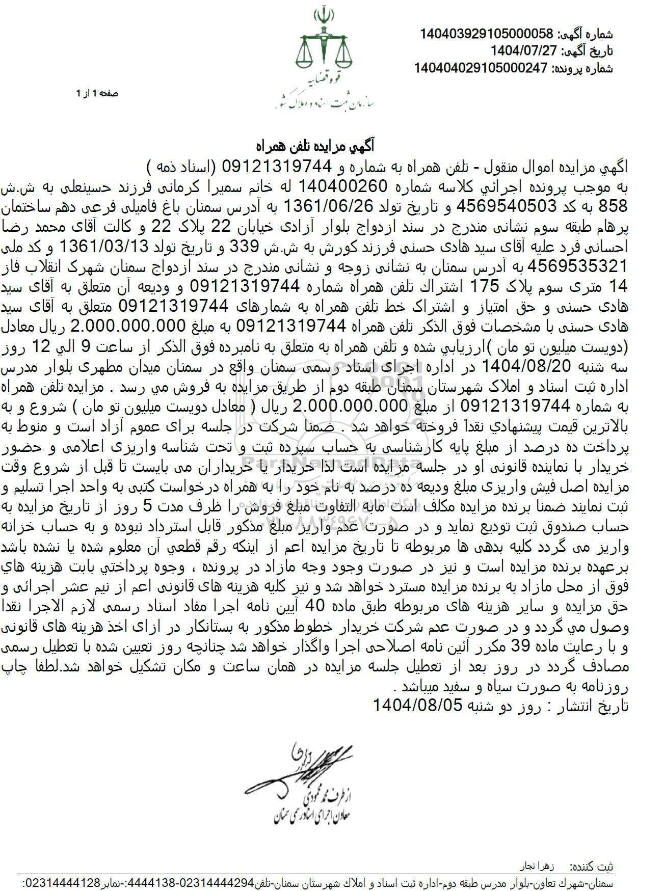 به موجب پرونده اجرائی کلاسه شماره 140400260 له خانم سمیرا کرمانی فرزند حسینعلی به ش.ش 858 به کد 4569540503 و تاریخ تولد 1361.06.26 به آدرس سمنان باغ فامیلی فرعی دهم ساختمان پرهام طبقه سوم نشانی مندرج در سند ازدواج بلوار آزادی خیابان 22 پلاک 22 و کالت آقای محمد رضا احسانی فرد علیه آقای سید هادی حسنی فرزند کورش به شش 339 و تاریخ تولد 1361.03.13 و کد ملی 4569535321 به آدرس سمنان به نشانی زوجه و نشانی مندرج در سند ازدواج سمنان شهرک انقلاب فاز 14 متری سوم پلاک 175 اشتراک تلفن همراه شماره 09121319744 و ودیعه آن متعلق به آقای سید هادی حسنی و حق امتیاز و اشتراک خط تلفن همراه به شمارهای 09121319744 متعلق به آقای سید هادی حسنی با مشخصات فوق الذكر تلفن همراه 09121319744 به مبلغ 2.000.000.000 ریال معادل دویست میلیون تومان ( ارزیابی شده و تلفن همراه به متعلق به نامبرده فوق الذکر از ساعت 9 الی 12 روز سه شنبه 1404.08.20 در اداره اجرای اسناد رسمی سمنان واقع در سمنان میدان مطهری بلوار مدرس اداره ثبت اسناد و املاک شهرستان سمنان طبقه دوم از طریق مزایده به فروش میرسد. مزایده تلفن همراه به شماره 09121319744 از مبلغ 2.000.000.000 ریال ( معادل دویست میلیون تومان ) شروع و به بالاترین قیمت پیشنهادی نقدا فروخته خواهد شد. ضمنا شرکت در جلسه برای عموم آزاد است و منوط به پرداخت ده درصد از مبلغ پایه کارشناسی به حساب سپرده ثبت و تحت شناسه واریزی اعلامی و حضور خریدار با نماینده قانونی او در جلسه مزایده است لذا خریدار یا خریداران می بایست تا قبل از شروع وقت مزایده اصل فیش واریزی مبلغ ودیعه ده درصد به نام خود را به همراه درخواست کتبی به واحد اجرا تسلیم و ثبت نمایند ضمنا برنده مزایده مکلف است ما به التفاوت مبلغ فروش را ظرف مدت 5 روز از تاریخ مزایده به حساب صندوق ثبت تودیع نماید و در صورت عدم واریز مبلغ مذکور قابل استرداد نبوده و به حساب خزانه واریز میگردد کلیه بدهیها مربوطه تا تاریخ مزایده اعم از اینکه رقم قطعی آن معلوم شده یا نشده باشد بر عهده برنده مزایده است و نیز در صورت وجود وجه مازاد در پرونده، وجوه پرداختی بابت هزینه های فوق از محل مازاد به برنده مزایده مسترد خواهد شد و نیز کلیه هزینه های قانونی اعم از نیم عشر اجرائی و حق مزایده و سایر هزینه های مربوطه طبق ماده 40 آیین نامه اجرا مفاد اسناد رسمى لازم الاجرا نقدا وصول می گردد و در صورت عدم شرکت خریدار خطوط مذکور به بستانکار در ازای اخذ هزینه های قانونی و با رعایت ماده 39 مکرر آئین نامه اصلاحی اجرا واگذار خواهد شد چنانچه روز تعیین شده با تعطیل رسمی مصادف گردد در روز بعد از تعطیل جلسه مزایده در همان ساعت و مکان تشکیل خواهد شد. لطفا چاپ روزنامه به صورت سیاه و سفید میباشد .