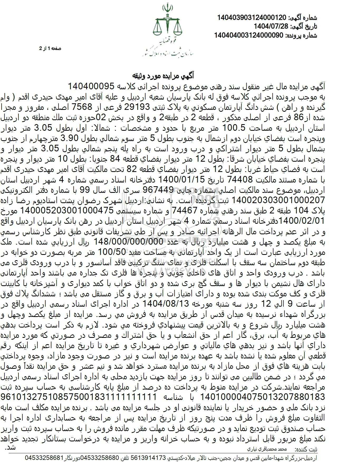 آگهی مزایده مال غیر منقول سند رهنی موضوع پرونده اجرائی کلاسه 140400095 به موجب پرونده اجرائی کلاسه فوق له بانک پارسیان شعبه اردبیل و علیه آقای امیر مهدی حیدری اقدم وام گیرنده و راهن شش دانگ آپارتمان مسکونی به پلاک ثبتی 29193 فرعی از 7568 اصلی ، مفروز و مجزا شده از 86 فرعی از اصلی مذکور ، قطعه 2 در طبقه 2 و واقع در بخش 02 حوزه ثبت ملک منطقه دو اردبیل استان اردبیل به مساحت 100.5 متر مربع با حدود و مشخصات : شمالا اول بطول 3.05 متر دیوار و پنجره است بفضای خیابان دوم از شمال به جنوب بطول 5 متر سوم شمالی بطول 3.90 متر چهارم از جنوب بشمال بطول 5 متر دیوار اشتراکی و درب ورود است به راه پله پنجم شمالی بطول 3.05 متر دیوار و پنجره است بفضای خیابان شرقا بطول 12 متر دیوار بفضای قطعه 84 جنوبا : بطول 10 متر دیوار و پنجره است به فضای حیاط غربا بطول 12 متر دیوار بفضای قطعه 82 تحت مالکیت آقای امیر مهدی حیدری اقدم با شماره مستند مالکیت 74408 تاریخ 1400.01.15 دفترخانه اسناد رسمی شماره 4 شهر اردبیل استان اردبیل موضوع سند مالکیت اصلی بشماره چاپی 967449 سری الف سال 99 با شماره دفتر الکترونیکی 140020303001000207 ثبت گردیده است به نشانی اردبیل شهرک رضوان پشت اسنادیوم رضا زاده پلاک 104 طبقه 2 طبق سند رهنی شماره 74467 و شماره سیستمى 140005203001000475 مورخ 1400.02.01 دفترخانه اسناد رسمی شماره 4 شهر اردبیل استان اردبیل در رهن بانک پارسیان اردبیل واقع و در اثر عدم پرداخت مال الرهانه اجرائیه صادر و پس از طی تشریفات قانونی طبق نظر کارشناس رسمی به مبلغ یکصد و چهل و هشت میلیارد ریال به عدد 148.000.000.000 ریال ارزیابی شده است. ملک مورد ارزیابی عبارت است از یک واحد آپارتمانی به مساحت مفید 100.50 متر مربه بصورت دو خوابه در طبقه دوم ساختمان سه سقف با اسکلت فلزی و نمای سنگ ترکیبی فاقد آسانسور و با درب ورودی فلزی می باشد . درب ورودی واحد و اتاقهای داخلی چوبی و پنجره ها فلزی تک جداره میباشند واحد آپارتمانی دارای هال نشیمن با دیوارها و سقف گچ بری شده و دو اتاق خواب با کمد دیواری و آشپزخانه با کابینت فلزی و کف موکت بندی شده بوده و دارای امتیازات آب و برق و گاز مستقل میباشد؛ ششدانگ پلاک فوق از ساعت 9 الی 12 روز سه شنبه مورخه 1404.08.13 در اداره اجرای اسناد رسمی اردبیل واقع در بزرگراه شهداء نرسیده به میدان قدس از طریق مزایده به فروش می رسد. مزایده از مبلغ یکصد و چهل و هشت میلیارد ریال شروع و به بالاترین قیمت پیشنهادی فروخته می شود. لازم به ذکر است پرداخت بدهی های مربوط به آب برق گاز اعم از حق انشعاب و یا حق اشتراک و مصرف در صورتی که مورد مزایده دارای آنها باشد و نیز بدهی های مالیاتی و عوارض شهرداری و غیره تا تاریخ مزایده اعم از اینکه رقم قطعی آن معلوم شده یا نشده باشد به عهده برنده مزایده است و نیز در صورت وجود مازاد، وجوه پرداختی بابت هزینه های فوق از محل مازاد به برنده مزایده مسترد خواهد شد و نیم عشر و حق مزایده نقداً وصول می گردد؛ در ضمن طالبین میتوانند تا روز مزایده جهت بازدید محلی به اداره اجرای اسناد رسمی اردبیل مراجعه نمایند. شرکت در مزایده منوط به پرداخت ده درصد از مبلغ پایه کارشناسی به حساب سپرده ثبت 961013275108575001831111111111 140100004075013207880183 با شناسه نزد بانک ملی و حضور خریدار یا نماینده قانونی او در جلسه مزایده میباشد. برنده مزایده مکلف است ما به التفاوت مبلغ فروش را ظرف مدت پنج روز از تاریخ مزایده پس از مراجعه به حسابداری اداره اجرا به حساب صندوق ثبت تودیع نماید و در صورتیکه ظرف مهلت مقرر مانده فروش را به حساب سپرده ثبت واریز نکند مبلغ مزبور قابل استرداد نبوده و به حساب خزانه واریز و مزایده به درخواست بستانکار تجدید خواهد شد.