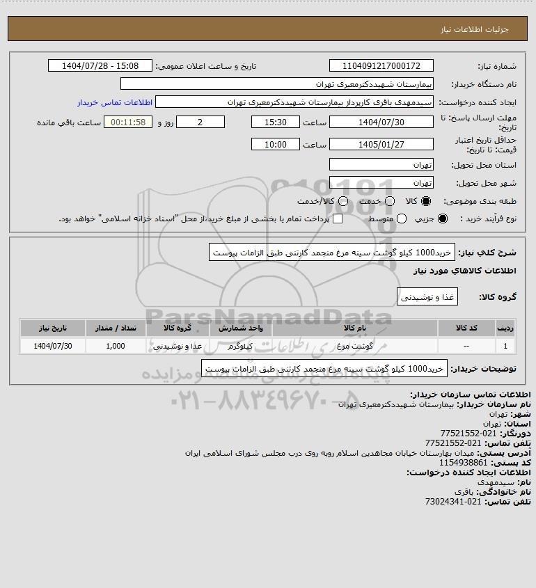 شرح کلی نیاز: خرید1000 کیلو گوشت سینه مرغ منجمد کارتنی طبق الزامات پیوست