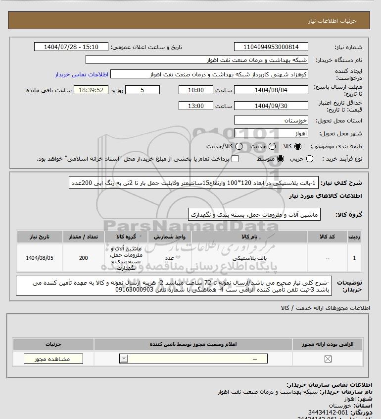 شرح کلی نیاز: 1-پالت پلاستیکی در ابعاد 120*100 وارتفاع15سانتیمتر وقابلیت حمل بار تا 2تن به رنگ ابی 200عدد