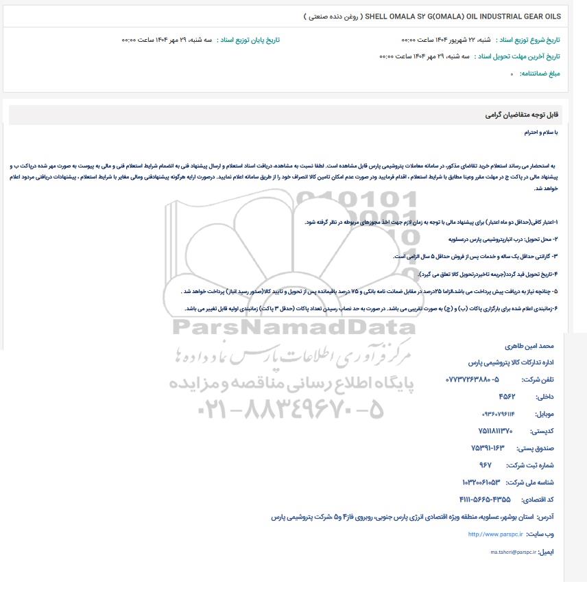 به استحضار می رساند استعلام خرید تقاضای مذکور در سامانه معاملات پتروشیمی پارس قابل مشاهده است. لطفا نسبت به مشاهده دریافت استاد استعلام و ارسال پیشنهاد فنی به انضمام شرایط استعلام فنی و مالی به پیوست به صورت مهر شده در پاکت ب و پیشنهاد مالی در پاکت چ در مهلت مقرر و عینا مطابق با شرایط استعلام ، اقدام فرمایید و در صورت عدم امکان تامین کالا انصراف خود را از طریق سامانه اعلام نمایید. در صورت ارایه هرگونه پیشنها دفنی و مالی مغایر با شرایط استعلام ، پیشنهادات دریافتی مردود اعلام