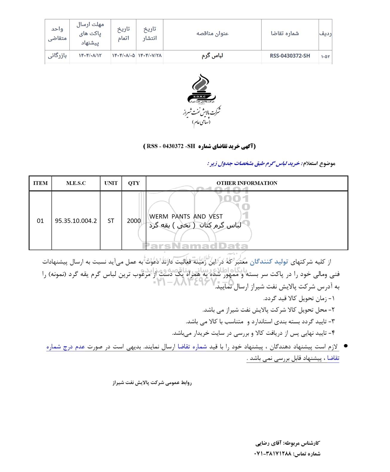 از کلیه شرکتهای تولیدکننده معتبر که در این زمینه فعالیت دارند دعوت به عمل می آید نسبت به ارسال پیشنهاد فنی و مالی خود را در پاکت سربسته و ممهور شده ه همراه یک دست از مرغوب ترین لباس گرم یقه گرد (نمونه) را به آدرس شرکت پالایش نفت شیراز ارسال نمایید.