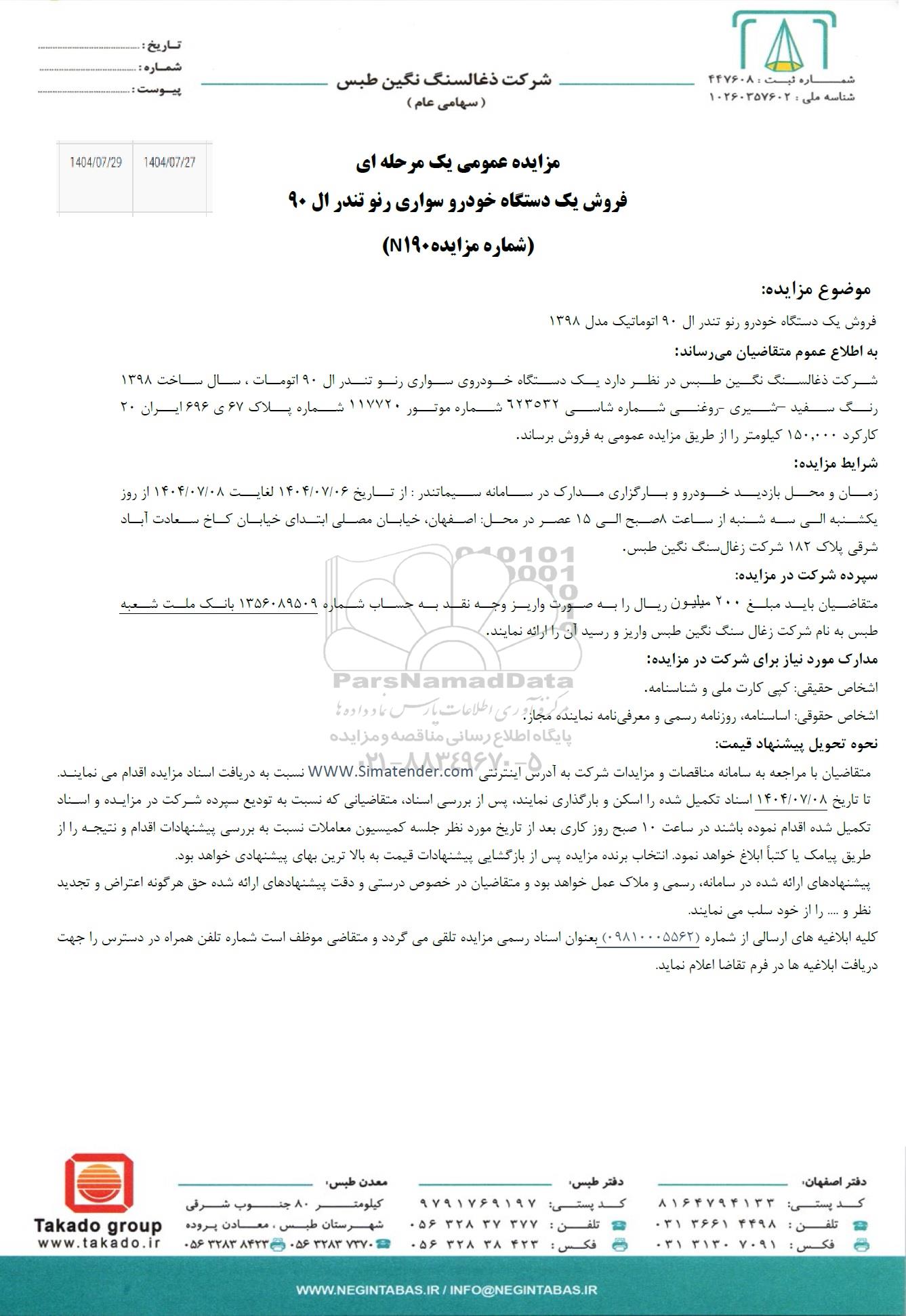 شرکت ذغالسنگ نگین طبس در نظر دارد یک دستگاه خودروی سواری رنو تندر ال 90 اتومات، سال ساخت 1398 رنگ سفید شیری روغنی شماره شاسی 623532 شماره موتور 117720 شماره پلاک 67 ی 696 ایران 20 کارکرد 150.000 کیلومتر را از طریق مزایده عمومی به فروش برساند.
