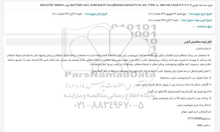 استعلام بها و موضوع استعلام استعلام خرید سه عدد باتری ... به اطلاع کلیه شرکتها و افراد متخصص واجد شرایط میرساند، آگهی گذار در نظر دارد از طریق استعلام بها، نسبت به انتخاب و دریافت پیشنهادات اقدام نماید. این استعلام با کد آگهی ثبت شده در سامانه خبرگزاری پارس نماد : 9727662 منتشر شده است. مشخصات استعلام : تاریخ شروع استعلام: 1404/07/28 آخرین مهلت ارسال پیشنهاد قیمت : 1404/08/03 و محل اجرای پروژه : استان بوشهر میباشد. استعلام قیمت مورد درخواست : استعلام خرید سه عدد باتری ... با دستهبندیهای تخصصی و گروه های مرتبط : منابع تغذیه, تجهیزات برق و الکترونیک, استعلام اطلاع رسانی میگردد.