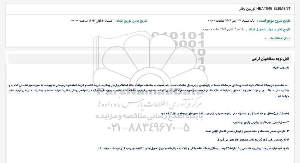 به استحضار می رساند استعلام خرید تقاضای مذکور در سامانه معاملات پتروشیمی پارس قابل مشاهده است. لطفا نسبت به مشاهده دریافت استاد استعلام و ارسال پیشنهاد فنی به انضمام شرایط استعلام فنی و مالی به پیوست به صورت مهر شده در پاکت ب و پیشنهاد مالی در پاکت ج در مهلت مقرر و عینا مطابق با شرایط استعلام اقدام فرمایید و در صورت عدم امکان تامین کالا انصراف خود را از طریق سامانه اعلام نمایید. در صورت ارایه هرگونه پیشنهاد فنی و مالی مغایر با شرایط استعلام پیشنهادات دریافتی مردود اعلام خواهد شد.