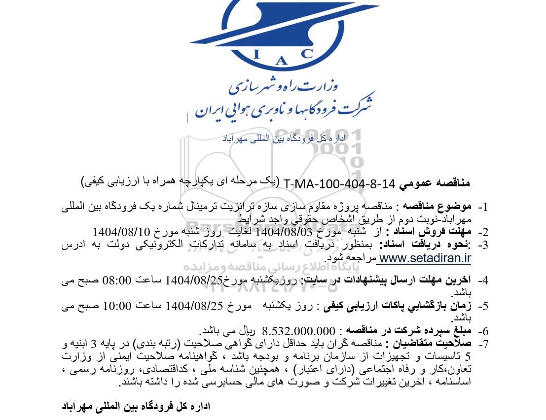 مناقصه عمومی 14-8-404-100-T-MA (یک مرحله ای یکپارچه همراه با ارزیابی کیفی)