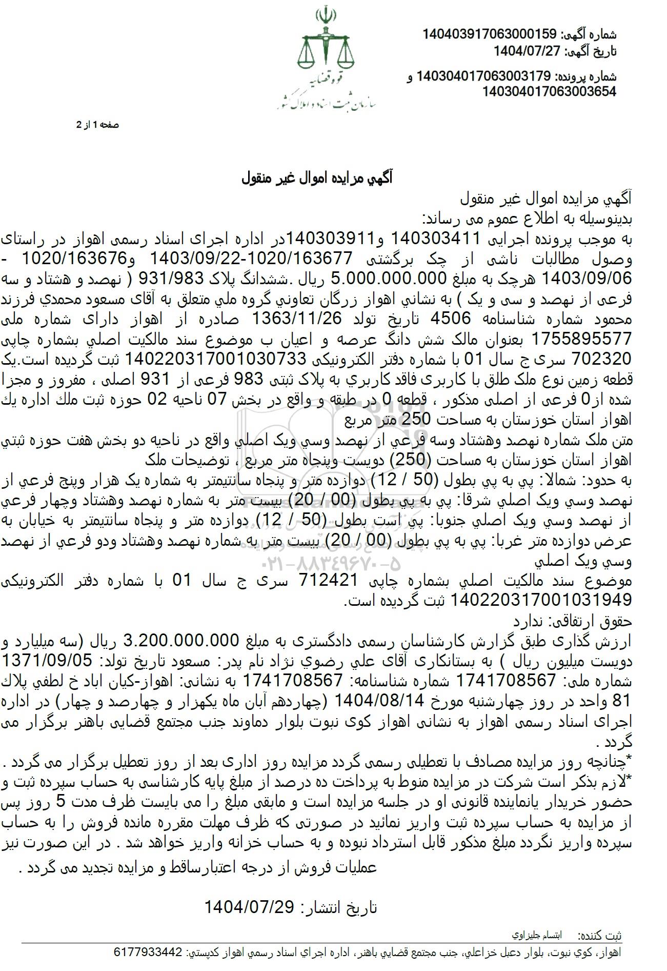 بدینوسیله به اطلاع عموم می رساندبه موجب پرونده اجرایی 140303411 و 140303911 در اداره اجرای اسناد رسمی اهواز در راستای - 1020.163676 وصول مطالبات ناشی از چک برگشتی 1020.163677-1403.09.22 و1403.09.06 هر چک به مبلغ 5.000.000.000 ریال ششدانگ پلاک 931.983 ( نهصد و هشتاد و سه فرعی از نهصد و سی و یک ) به نشانی اهواز زرگان تعاونی گروه ملی متعلق به آقای مسعود محمدی فرزند محمود شماره شناسنامه 4506 تاریخ تولد 1363.11.26 صادره از اهواز دارای شماره ملی 1755895577 بعنوان مالک شش دانگ عرصه و اعیان با موضوع سند مالکیت اصلی بشماره چاپی 702320 سری ج سال 01 با شماره دفتر الکترونیکی 140220317001030733 ثبت گردیده است. یک قطعه زمین نوع ملک طلق با کاربری فاقد کاربری به پلاک ثبتی 983 فرعی از 931 اصلی ، مفروز و مجزا شده از 0 فرعی از اصلی مذکور ، قطعه 0 در طبقه و واقع در بخش 07 ناحیه 02 حوزه ثبت ملک اداره یک اهواز استان خوزستان به مساحت 250 متر مربعمتن ملک شماره نهصد و هشتاد و سه فرعی از نهصد و سی و یک اصلی واقع در ناحیه دو بخش هفت حوزه ثبتی اهواز استان خوزستان به مساحت (250) دویست و پنجاه متر مربع ، توضیحات ملکبه حدود شمالا پی به پی بطول (50) . (12) دوازده متر و پنجاه سانتیمتر به شماره یک هزار و پنج فرعی از نهصد و سی و یک اصلی شرقا پی به پی یطول (00 . 20) بیست متر به شماره نهصد و هشتاد و چهار فرعی از نهصد و سی و یک اصلی جنوبا پی است بطول (50) . (12) دوازده متر و پنجاه سانتیمتر به خیابان به عرض دوازده متر غربا پی به پی بطول 00 . 20) بیست متر به شماره نهصد و هشتاد و دو فرعی از نهصد وسی و یک اصلیموضوع سند مالکیت اصلی بشماره چاپی 712421 سری ج سال 01 با شماره دفتر الکترونیکی .140220317001031949 ثبت گردیده استحقوق ارتفاقی نداردارزش گذاری طبق گزارش کارشناسان رسمی دادگستری به مبلغ 3.200.000.000 ریال سه میلیارد و دویست میلیون ریال به بستانکاری آقای علی رضوی نژاد نام پدر مسعود تاریخ تولد: 1371.09.05 شماره ملی : 1741708567 شماره شناسنامه 1741708567 به نشانی اهواز کیان آباد خ لطفی بلاک 81 واحد در روز چهارشنبه مورخ 1404.08.14 چهاردهم آبان ماه یکهزار و چهارصد و چهار در اداره اجرای اسناد رسمی اهواز به نشانی اهواز کوی نبوت بلوار دماوند جنب مجتمع قضایی باهنر برگزار می گردد .چنانچه روز مزایده مصادف با تعطیلی رسمی گردد مزایده روز اداری بعد از روز تعطیل برگزار می گردد . لازم بذکر است شرکت در مزایده منوط به پرداخت ده درصد از مبلغ پایه کارشناسی به حساب سپرده ثبت و حضور خریدار یا نماینده قانونی او در جلسه مزایده است و مابقی مبلغ را می بایست ظرف مدت 5 روز پس از مزایده به حساب سپرده ثبت واریز نمائید در صورتی که ظرف مهلت مقرره مانده فروش را به حساب سپرده واریز نگردد مبلغ مذکور قابل استرداد نبوده و به حساب خزانه واریز خواهد شد. در این صورت نیزعملیات فروش از درجه اعتبار ساقط و مزایده تجدید می گردد .