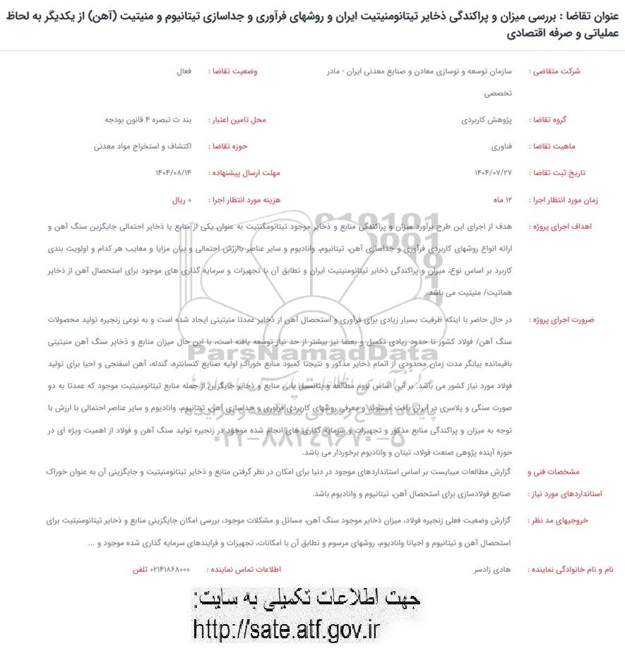 عنوان تقاضا : بررسی میزان و پراکندگی ذخایر تیتانومنیتیت ایران و روشهای فرآوری و جداسازی تیتانیوم و منیتیت (آهن) از یکدیگر به لحاظ عملیاتی و صرفه اقتصادی