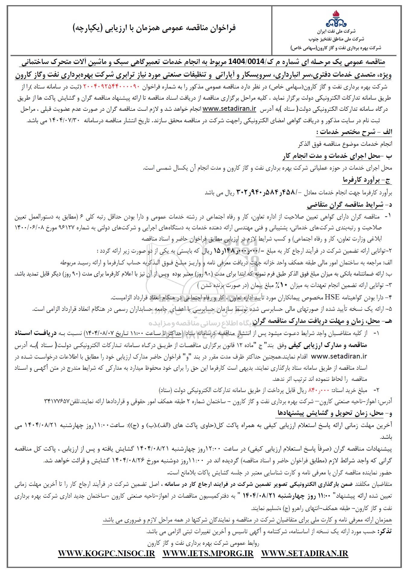 مناقصه عمومی یک مرحله ای شماره م ک / 1404/0014 مربوط به انجام خدمات تعمیرگاهی سبک و ماشین آلات متحرک ساختمانی ویژه متصدی خدمات دفتری؛ سر انبارداری، سرویسکار و آپاراتی و تنظیفات صنعتی مورد نیاز ترابری شرکت بهره برداری نفت و گاز کارون