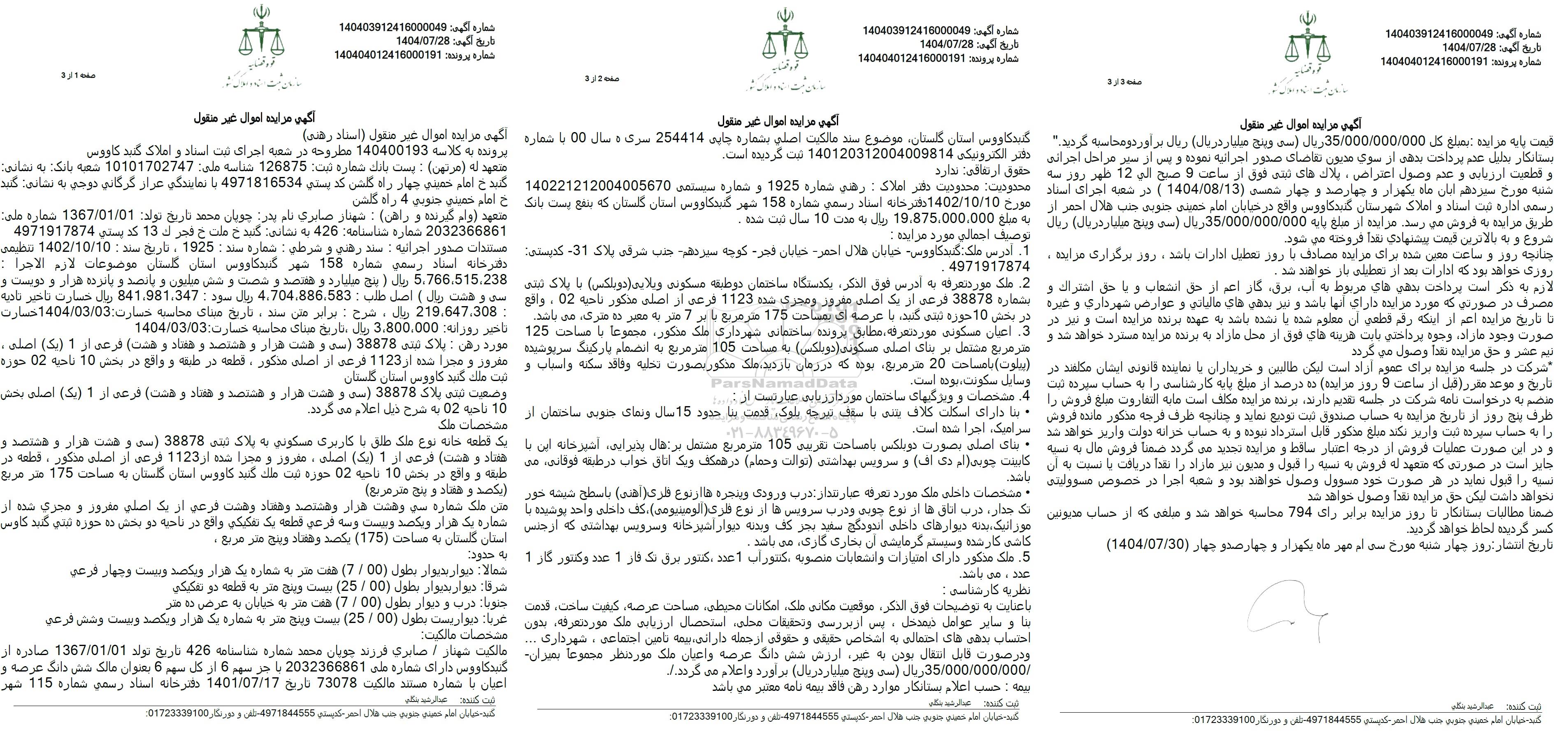 مزایده فروش پلاک ثبتی 38878 (سی و هشت هزار و هشتصد و هفتاد و هشت) فرعی از 1 (یک)، اصلی، مفروز و مجزا شده از 1123 فرعی از اصلی مذکور، قطعه در طبقه و واقع در بخش 10 ناحیه 02 حوزه ثبت ملک گنبدکاووس استان گلستان