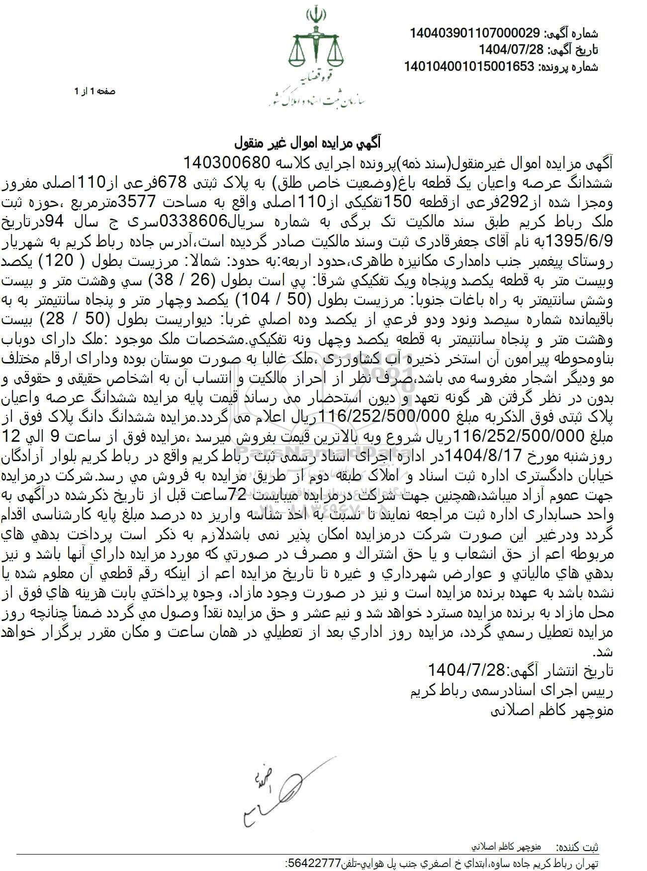 آگهی مزایده اموال غیر منقول (سند) ذمه پرونده اجرایی کلاسه 140300680 ششدانگ عرصه و اعیان یک قطعه باغ وضعیت خاص (طلق به پلاک ثبتی 678 فرعی از 110 اصلی مفروز و مجزا شده از 292 فرعی از قطعه 150 تفکیکی از 110 اصلی واقع به مساحت 3577 متر مربع ، حوزه ثبت ملک رباط کریم طبق سند مالکیت تک برگی به شماره سریال 0338606 سری ج سال 94 در تاریخ 1395.6.9 به نام آقای جعفر قادری ثبت و سند مالکیت صادر گردیده است آدرس جاده رباط کریم به شهریار روستای پیغمبر جنب دامداری مکانیزه طاهری حدود اربعه به حدود شمالا مرزیست بطول ( 120 ) یکصد و بیست متر به قطعه یکصد و پنجاه و یک تفکیکی شرقا پی است بطول (26) . (38) سی و هشت متر و بیست وشش سانتیمتر به راه باغات جنوبا مرزیست بطول (50) . (104) یکصد و چهار متر و پنجاه سانتیمتر به به باقیمانده شماره سیصد و نود و دو فرعی از یکصد وده اصلی غربا دیواریست بطول 50 . 28) بیست و هشت متر و پنجاه سانتیمتر به قطعه یکصد و چهل و نه تفکیکی. مشخصات ملک موجود ملک دارای دوباب بنا و محوطه پیرامون آن استخر ذخیره آب کشاورزی ، ملک غالبا به صورت موستان بوده و دارای ارقام مختلف مو و دیگر اشجار مغروسه میباشد صرف نظر از احراز مالکیت و انتساب آن به اشخاص حقیقی و حقوقی و بدون در نظر گرفتن هر گونه تعهد و دیون استحضار میرساند قیمت پایه مزایده ششدانگ عرصه و اعیان پلاک ثبتی فوق الذکریه مبلغ 116.252.500.000 ریال اعلام میگردد. مزایده ششدانگ دانگ پلاک فوق از مبلغ 116.252.500.000 ریال شروع و به بالاترین قیمت بفروش میرسد مزایده فوق از ساعت 9 الی 12 روزشنبه مورخ 1404.8.17 در اداره اجرای اسناد رسمی ثبت رباط کریم واقع در رباط کریم بلوار آزادگان خیابان دادگستری اداره ثبت اسناد و املاک طبقه دوم از طریق مزایده به فروش می رسد. شرکت در مزایده جهت عموم آزاد میباشد همچنین جهت شرکت در مزایده میبایست 72 ساعت قبل از تاریخ ذکر شده در آگهی به واحد حسابداری اداره ثبت مراجعه نمایند تا نسبت به اخذ شناسه واریز ده درصد مبلغ پایه کارشناسی اقدام گردد و در غیر این صورت شرکت در مزایده امکان پذیر نمی باشد لازم به ذکر است پرداخت بدهی های مربوطه اعم از حق انشعاب و یا حق اشتراک و مصرف در صورتی که مورد مزایده دارای آنها باشد و نیز بدهی های مالیاتی و عوارض شهرداری و غیره تا تاریخ مزایده اعم از اینکه رقم قطعی آن معلوم شده یا نشده باشد به عهده برنده مزایده است و نیز در صورت وجود مازاد وجوه پرداختی بابت هزینه های فوق از محل مازاد به برنده مزایده مسترد خواهد شد و نیم عشر و حق مزایده نقداً وصول میگردد ضمنا چنانچه روز مزایده تعطیل رسمی گردد مزایده روز اداری بعد از تعطیلی در همان ساعت و مکان مقرر برگزار خواهد شد.