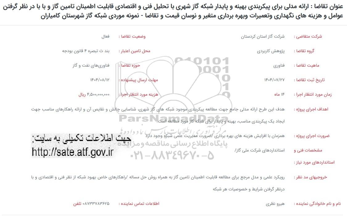 علاقهمندان میتوانند جهت دریافت اسناد و اطلاعات تکمیلی، فراخوان ارائه مدلی برای پیکربندی بهینه و پایدار شبکه گاز شهری با سامانه مناقصات و مزایدات ایران پارسنماد داده ها 88349670 تماس حاصل نمایند.