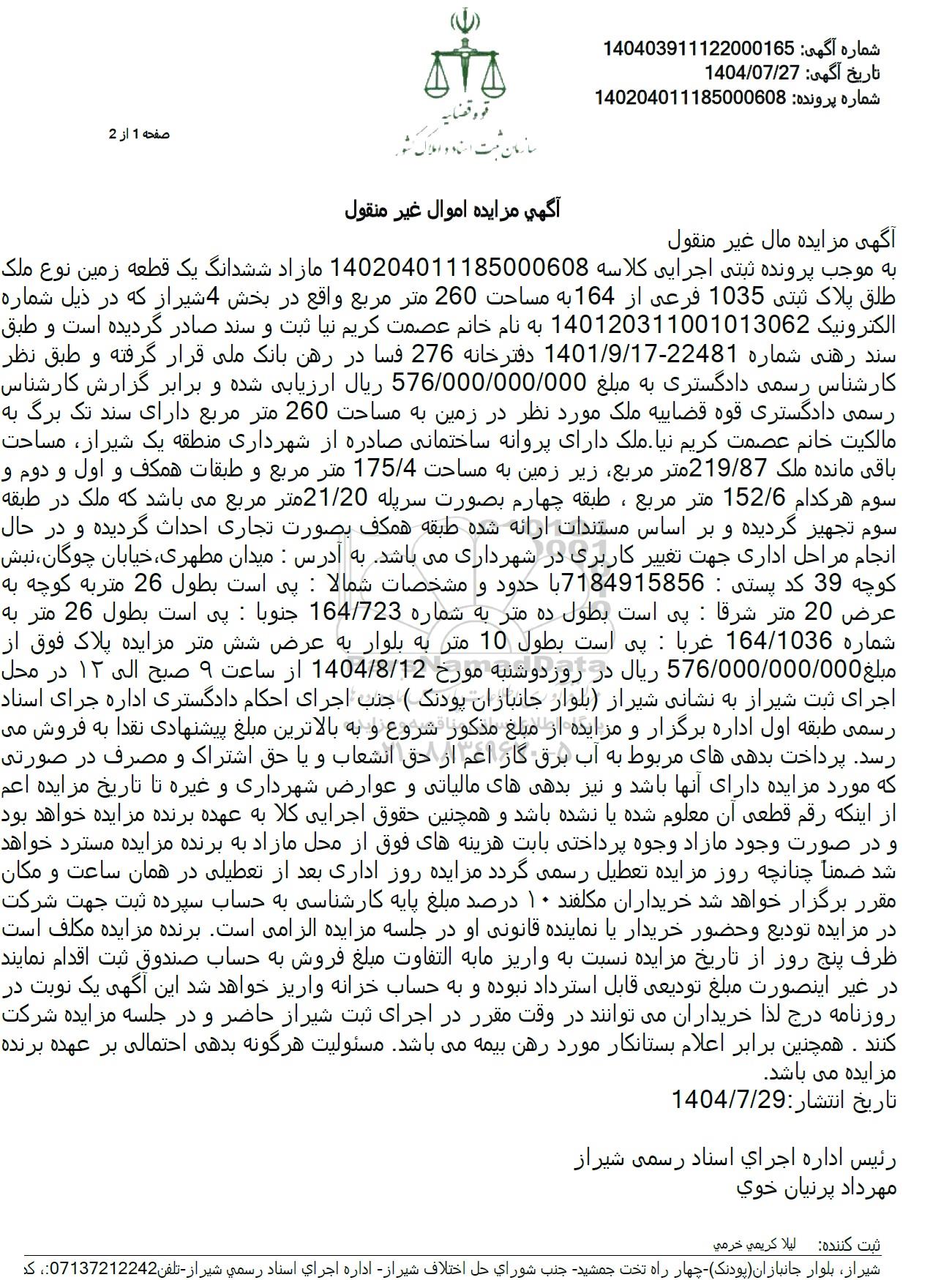 به موجب پرونده ثبتی اجرایی کلاسه 140204011185000608 مازاد ششدانگ یک قطعه زمین نوع ملک طلق پلاک ثبتی 1035 فرعی از 164 به مساحت 260 متر مربع واقع در بخش 4 شیراز که در ذیل شماره الکترونیک 140120311001013062 به نام خانم عصمت کریم نیا ثبت و سند صادر گردیده است و طبق سند رهنی شماره 22481-1401.9.17 دفترخانه 276 فسا در رهن بانک ملی قرار گرفته و طبق نظر کارشناس رسمی دادگستری به مبلغ 576.000.000.000 ریال ارزیابی شده و برابر گزارش کارشناس رسمی دادگستری قوه قضاییه ملک مورد نظر در زمین به مساحت 260 متر مربع دارای سند تک برگ به مالکیت خانم عصمت کریم نیا ملک دارای پروانه ساختمانی صادره از شهرداری منطقه یک شیراز مساحت باقی مانده ملک 219/87 متر مربع زیر زمین به مساحت 175/4 متر مربع و طبقات همکف و اول و دوم و سوم هر کدام 152/6 متر مربع ، طبقه چهارم بصورت سرپله 21/20 متر مربع میباشد که ملک در طبقه سوم تجهیز گردیده و بر اساس مستندات ارائه شده طبقه همکف بصورت تجاری احداث گردیده و در حال انجام مراحل اداری جهت تغییر کاربری در شهرداری میباشد. به آدرس : میدان مطهری، خیابان چوگان، نبش کوچه 39 کد پستی : 7184915856 با حدود و مشخصات شمالا : پی است بطول 26 متربه کوچه به عرض 20 متر شرقا : پی است بطول ده متر به شماره 164/723 جنوبا : پی است بطول 26 متر به شماره 164/1036 غربا : پی است بطول 10 متر به بلوار به عرض شش متر مزایده پلاک فوق از مبلغ 576.000.000.000 ریال در روز دوشنبه مورخ 1404.08.12 از ساعت 9 صبح الی 13 در محل اجرای ثبت شیراز به نشانی شیراز (بلوار جانبازان پودنک ) جنب اجرای احکام دادگستری اداره جرای اسناد رسمی طبقه اول اداره برگزار و مزایده از مبلغ مذکور شروع و به بالاترین مبلغ پیشنهادی نقدا به فروش می رسد. پرداخت بدهی های مربوط به آب برق گاز اعم از حق انشعاب و یا حق اشتراک و مصرف در صورتی که مورد مزایده دارای آنها باشد و نیز بدهی های مالیاتی و عوارض شهرداری و غیره تا تاریخ مزایده اعم از اینکه رقم قطعی آن معلوم شده یا نشده باشد و همچنین حقوق اجرایی کلا به عهده برنده مزایده خواهد بود و در صورت وجود مازاد وجوه پرداختی بابت هزینه های فوق از محل مازاد به برنده مزایده مسترد خواهد شد ضمنا چنانچه روز مزایده تعطیل رسمی گردد مزایده روز اداری بعد از تعطیلی در همان ساعت و مکان مقرر برگزار خواهد شد خریداران مکلفند 10 درصد مبلغ پایه کارشناسی به حساب سپرده ثبت جهت شرکت در مزایده تودیع و حضور خریدار یا نماینده قانونی او در جلسه مزایده الزامی است برنده مزایده مکلف است. ظرف پنج روز از تاریخ مزایده نسبت به واریز مابه التفاوت مبلغ فروش به حساب صندوق ثبت اقدام نمایند در غیر اینصورت مبلغ تودیعی قابل استرداد نبوده و به حساب خزانه واریز خواهد شد این آگهی یک نوبت در روزنامه درج لذا خریداران میتوانند در وقت مقرر در اجرای ثبت شیراز حاضر و در جلسه مزایده شرکت کنند. همچنین برابر اعلام بستانکار مورد رهن بیمه میباشد مسئولیت هرگونه بدهی احتمالی بر عهده برنده مزایده می باشد.