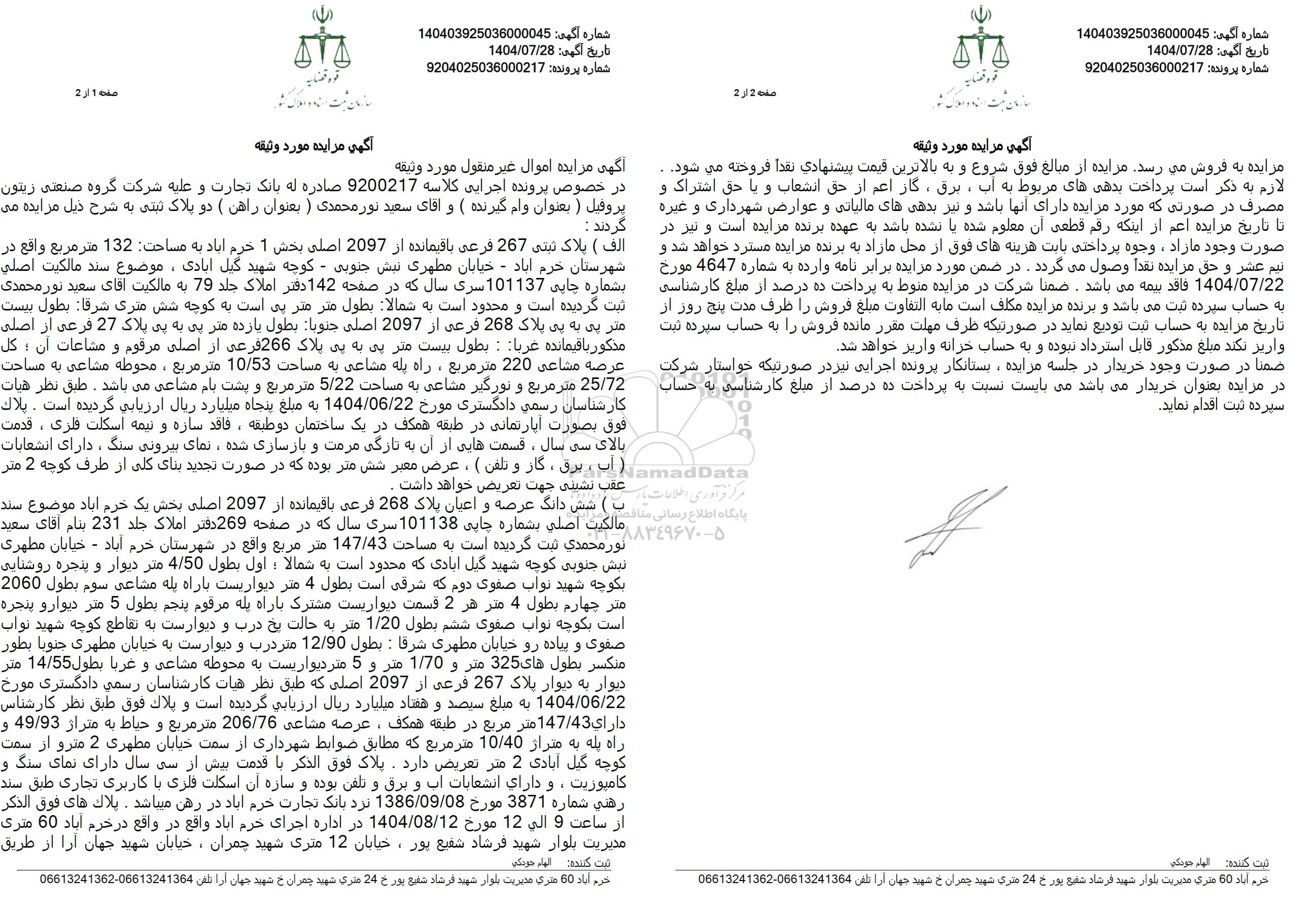الف ) پلاک ثبتی 267 فرعی باقیمانده از 2097 اصلی بخش 1 خرم آباد به مساحت 132 متر مربع واقع در شهرستان خرم آباد - خیابان مطهری نبش جنوبی - کوچه شهید گیل آبادی، موضوع سند مالكيت اصلي بشماره چایی 101137 سری سال که در صفحه 142 دفتر املاک جلد 79 به مالکیت آقای سعید نورمحمدی ثبت گردیده است و محدود است به شمالا بطول متر متر پی است به کوچه شش متری شرقا بطول بیست متر پی به بی پلاک 268 فرعی از 2097 اصلی جنوبا بطول یازده متر پی به بی پلاک 27 فرعی از اصلی مذکور باقیمانده غربا : بطول بیست متر پی به بی پلاک 266 فرعی از اصلی مرقوم و مشاعات آن ، کل عرصه مشاعی 220 متر مربع، راه پله مشاعی به مساحت 10.53 متر مربع ، محوطه مشاعی به مساحت 25.72 متر مربع و نورگیر مشاعی به مساحت 5.22 متر مربع و پشت بام مشاعی می باشد . طبق نظر هیات کارشناسان رسمی دادگستری مورخ 1404.06.22 به مبلغ پنجاه میلیارد ریال ارزیابی گردیده است . پلاک فوق بصورت آپارتمانی در طبقه همکف در یک ساختمان دو طبقه، فاقد سازه و نیمه اسکلت فلزی ، قدمت بالای سی سال ، قسمتهایی از آن به تازگی مرمت و بازسازی شده، نمای بیرونی سنگ ، دارای انشعابات آب ، برق ، گاز و تلفن ) . عرض معبر شش متر بوده که در صورت تجدید بنای کلی از طرف کوچه 2 متر عقب نشینی جهت تعریض خواهد داشت .