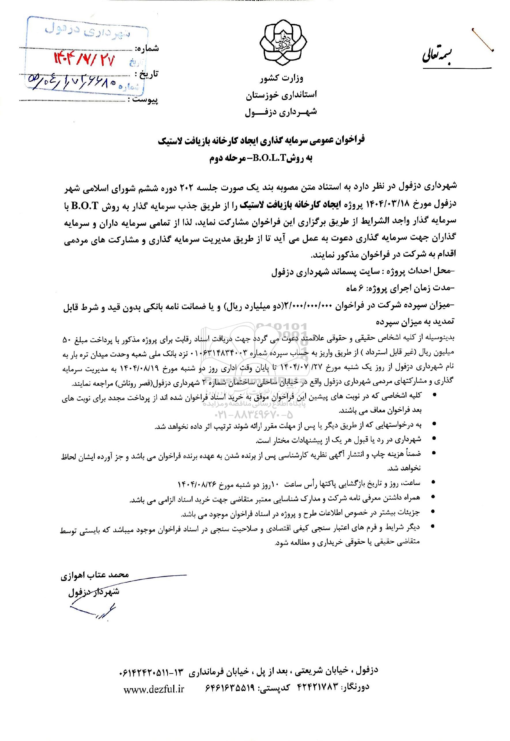 شهرداری دزفول در نظر دارد به استناد متن مصوبه بند دو صورت جلسه 202 دوره ششم شورای اسلامی شهر دزفول مورخ 1404.3.18 پروژه ایجاد کارخانه بازیافت لاستیک را از طریق جذب سرمایه گذار به روش B.O.T با سرمایه گذار واجد الشرایط از طریق برگزاری این فراخوان مشارکت نماید لذا از تمامی سرمایه داران و سرمایه گذاران جهت سرمایه گذاری دعوت به عمل می آید تا از طریق مدیریت سرمایه گذاری و مشارکتهای مردمی اقدام به شرکت در فراخوان مذکور نمایند.