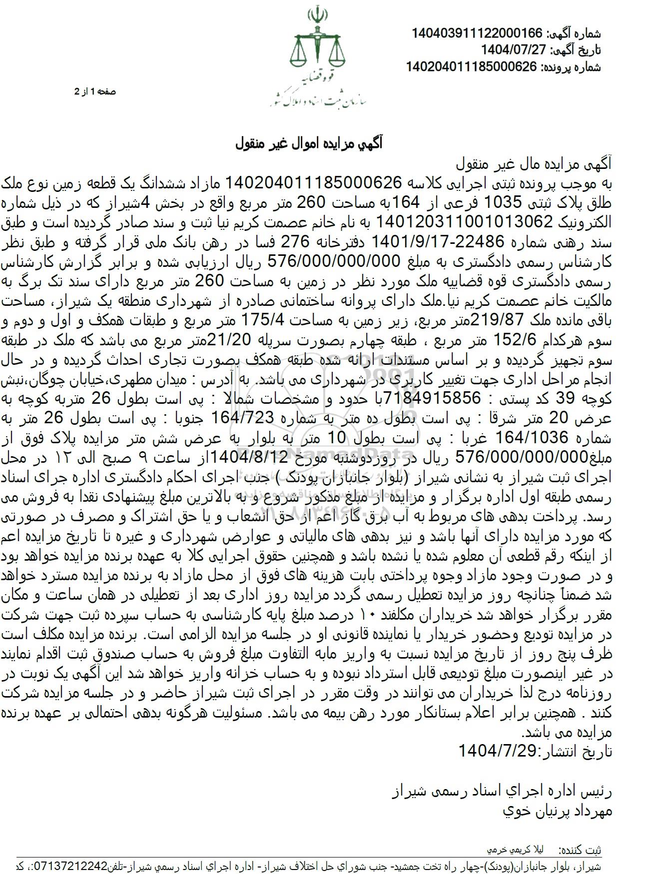 به موجب پرونده ثبتی اجرایی کلاسه 140204011185000626 مازاد ششدانگ یک قطعه زمین نوع ملک طلق پلاک ثبتی 1035 فرعی از 164 به مساحت 260 متر مربع واقع در بخش 4 شیراز که در ذیل شماره الکترونیک 140120311001013062 به نام خانم عصمت كریم نیا ثبت و سند صادر گردیده است و طبق سند رهنی شماره 22486-1401.9.17 دفترخانه 276 فسا در رهن بانک ملی قرار گرفته و طبق نظر کارشناس رسمی دادگستری به مبلغ 576.000.000.000 ريال ارزیابی شده و برابر گزارش کارشناس رسمی دادگستری قوه قضاییه ملک مورد نظر در زمین به مساحت 260 متر مربع دارای سند تک برگ به مالکیت خانم عصمت كریم نیا ملک دارای پروانه ساختمانی صادره از شهرداری منطقه یک شیراز مساحت باقی مانده ملک 219.87 متر مربع زیر زمین به مساحت 175.4 متر مربع و طبقات همکف و اول و دوم و سوم هر کدام 152.6 متر مربع ، طبقه چهارم بصورت سرپله 21.20 متر مربع میباشد که ملک در طبقه سوم تجهیز گردیده و بر اساس مستندات ارائه شده طبقه همکف بصورت تجاری احداث گردیده و در حال انجام مراحل اداری جهت تغییر کاربری در شهرداری میباشد. به آدرس : میدان مطهری، خیابان چوگان، نبش کوچه 39 کد پستی : 7184915856 با حدود و مشخصات شمالا : پی است بطول 26 متر به کوچه به عرض 20 متر شرقا : پی است بطول ده متر به شماره 164.723 جنوبا : پی است بطول 26 متر به شماره 164.1036 غربا : پی است بطول 10 متر به بلوار به عرض شش متر مزایده پلاک فوق از مبلغ 576.000.000.000 ریال در روز دوشنبه مورخ 1404.8.12 از ساعت 9 صبح الی 12 در محل اجرای ثبت شیراز به نشانی شیراز (بلوار جانبازان پودنک) جنب اجرای احکام دادگستری اداره جرای اسناد رسمی طبقه اول اداره برگزار و مزایده از مبلغ مذکور شروع و به بالاترین مبلغ پیشنهادی نقدا به فروش می رسد. پرداخت بدهی های مربوط به آب برق گاز اعم از حق انشعاب و یا حق اشتراک و مصرف در صورتی که مورد مزایده دارای آنها باشد و نیز بدهی های مالیاتی و عوارض شهرداری و غیره تا تاریخ مزایده اعم از اینکه رقم قطعی آن معلوم شده یا نشده باشد و همچنین حقوق اجرایی کلا به عهده برنده مزایده خواهد بود و در صورت وجود مازاد وجوه پرداختی بابت هزینه های فوق از محل مازاد به برنده مزایده مسترد خواهد شد ضمنا چنانچه روز مزایده تعطیل رسمی گردد مزایده روز اداری بعد از تعطیلی در همان ساعت و مکان مقرر برگزار خواهد شد. خریداران مکلفند 10 درصد مبلغ پایه کارشناسی به حساب سپرده ثبت جهت شرکت در مزایده تودیع و حضور خریدار یا نماینده قانونی او در جلسه مزایده الزامی است. برنده مزایده مکلف است ظرف پنج روز از تاریخ مزایده نسبت به واریز مابه التفاوت مبلغ فروش به حساب صندوق ثبت اقدام نمایند در غیر اینصورت مبلغ تودیعی قابل استرداد نبوده و به حساب خزانه واریز خواهد شد. این آگهی یک نوبت در روزنامه درج لذا خریداران میتوانند در وقت مقرر در اجرای ثبت شیراز حاضر و در جلسه مزایده شرکت کنند. همچنین برابر اعلام بستانکار مورد رهن بیمه میباشد مسئولیت هرگونه بدهی احتمالی بر عهده برنده مزایده می باشد.