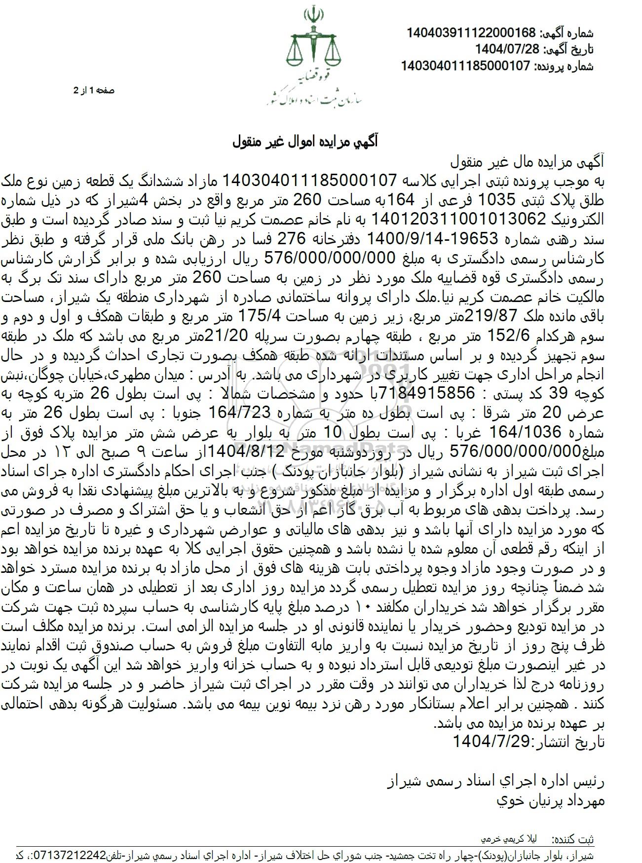 به موجب پرونده ثبتی اجرایی کلاسه 140304011185000107 مازاد ششدانگ یک قطعه زمین نوع ملک طلق پلاک ثبتی 1035 فرعی از 164 به مساحت 260 متر مربع واقع در بخش 4 شیراز که در ذیل شماره الکترونیک 140120311001013062 به نام خانم عصمت کریم نیا ثبت و سند صادر گردیده است و طبق سند رهنی شماره 19653-1400.9.14 دفترخانه 276 فسا در رهن بانک ملی قرار گرفته و طبق نظر کارشناس رسمی دادگستری به مبلغ 576.000.000.000 ریال ارزیابی شده و برابر گزارش کارشناس رسمی دادگستری قوه قضاییه ملک مورد نظر در زمین به مساحت 260 متر مربع دارای سند تک برگ به مالكيت خانم عصمت كریم نیا ملک دارای پروانه ساختمانی صادره از شهرداری منطقه یک شیراز مساحت باقی مانده ملک 219.87 متر مربع زیر زمین به مساحت 175.4 متر مربع و طبقات همکف و اول و دوم و سوم هر کدام 152.6 متر مربع ، طبقه چهارم بصورت سرپله 21.20 متر مربع میباشد که ملک در طبقه سوم تجهیز گردیده و بر اساس مستندات ارائه شده طبقه همکف بصورت تجاری احداث گردیده و در حال انجام مراحل اداری جهت تغییر کاربری در شهرداری میباشد به آدرس : میدان مطهری، خیابان چوگان نبش کوچه 39 کد پستی : 7184915856 با حدود و مشخصات شمالا : پی است بطول 26 متر به کوچه به عرض 20 متر شرقا : پی است بطول ده متر به شماره 164.723 جنوبا : پی است بطول 26 متر به شماره 164.1036 غربا : پی است بطول 10 متر به بلوار به عرض شش متر مزایده پلاک فوق از مبلغ 576.000.000.000 ریال در روز دوشنبه مورخ 1404.08.12 از ساعت 9 صبح الی 12 در محل اجرای ثبت شیراز به نشانی شیراز بلوار جانبازان پودنک جنب اجرای احکام دادگستری اداره جرای اسناد رسمی طبقه اول اداره برگزار و مزایده از مبلغ مذکور شروع و به بالاترین مبلغ پیشنهادی نقدا به فروش می رسد. پرداخت بدهیهای مربوط به آب برق گاز اعم از حق انشعاب و یا حق اشتراک و مصرف در صورتی که مورد مزایده دارای آنها باشد و نیز بدهیهای مالیاتی و عوارض شهرداری و غیره تا تاریخ مزایده اعم از اینکه رقم قطعی ان معلوم شده یا نشده باشد و همچنین حقوق اجرایی کلا به عهده برنده مزایده خواهد بود و در صورت وجود مازاد وجوه پرداختی بابت هزینه های فوق از محل مازاد به برنده مزایده مسترد خواهد شد ضمنا چنانچه روز مزایده تعطیل رسمی گردد مزایده روز اداری بعد از تعطیلی در همان ساعت و مکان مقرر برگزار خواهد شد خریداران مکلفند 10 درصد مبلغ پایه کارشناسی به حساب سپرده ثبت جهت شرکت در مزایده تودیع و حضور خریدار یا نماینده قانونی او در جلسه مزایده الزامی است برنده مزایده مکلف است. ظرف پنج روز از تاریخ مزایده نسبت به واريز ما به التفاوت مبلغ فروش به حساب صندوق ثبت اقدام نمایند در غیر اینصورت مبلغ تودیعی قابل استرداد نبوده و به حساب خزانه واریز خواهد شد این آگهی یک نوبت در روزنامه درج لذا خریداران میتوانند در وقت مقرر در اجرای ثبت شیراز حاضر و در جلسه مزایده شرکت کنند . همچنین برابر اعلام بستانکار مورد رهن نزد بیمه نوین بیمه میباشد مسئولیت هرگونه بدهی احتمالی بر عهده برنده مزایده می باشد.