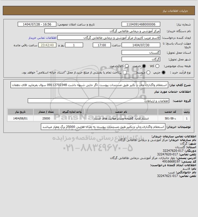 شرح کلی نیاز: استعلام واگذاری چاپ و تکثیر طبق مستندات پیوست .اگر جایی شبهه داشت 09112702348 سوال بفرمایید اقای دهقان