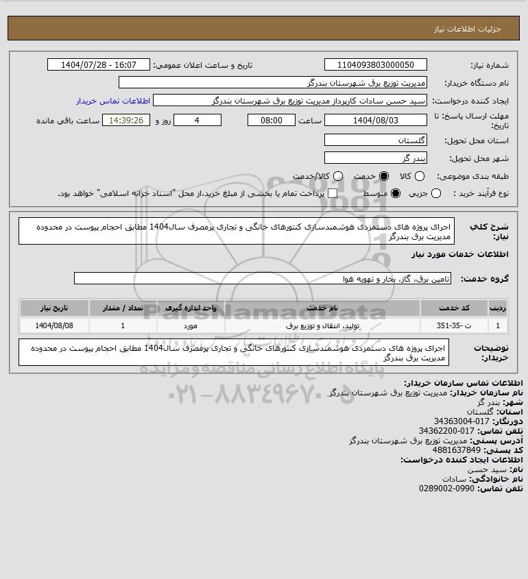 شرح کلی نیاز: اجرای پروژه های دستمزدی هوشمندسازی کنتورهای خانگی و تجاری پرمصرف سال1404 مطابق احجام پیوست در محدوده مدیریت برق بندرگز