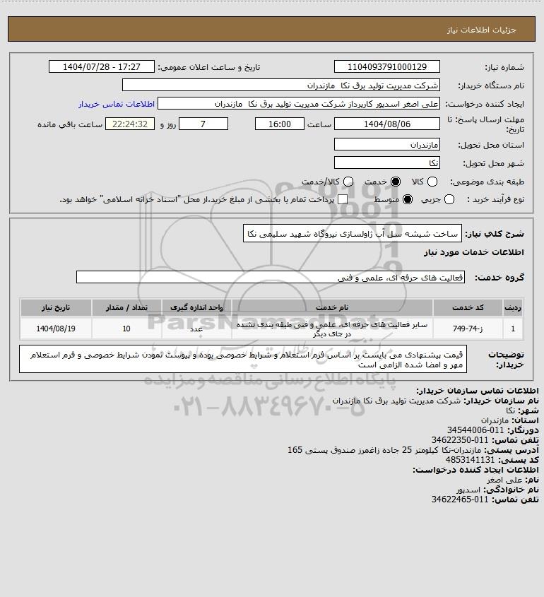 شرح کلی نیاز: ساخت شیشه سل آب ژاولسازی نیروگاه شهید سلیمی نکا