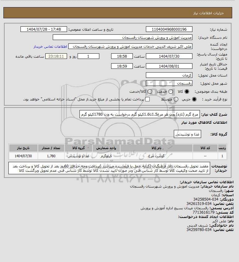 شرح کلی نیاز: مرغ گرم (تازه) وزن هر مرغ1.5تا1.6کیلو گرم درخواست به وزن 1780کیلو گرم