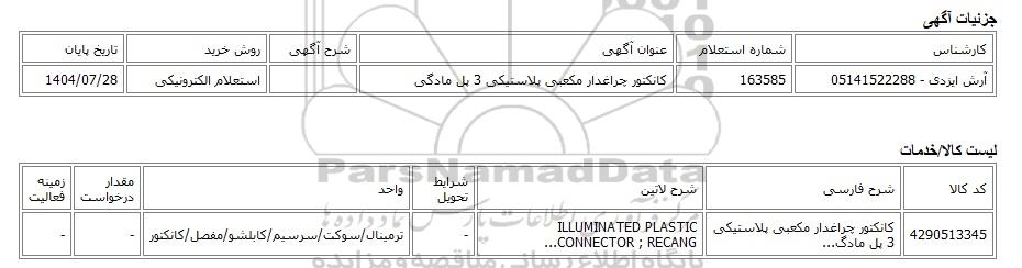آرش ایزدی - 05141522288 | 163585 | کانکتور چراغدار مکعبی پلاستیکی 3 پل مادگی | استعلام الکترونیکی | 1404/07/28 |