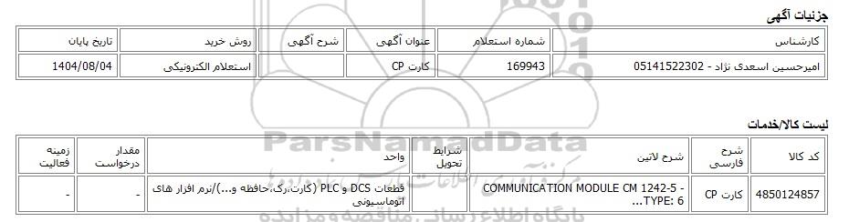 | 4850124857 | کارت CP | COMMUNICATION MODULE CM 1242-5 - TYPE: 6... | قطعات DCS و PLC (کارت،رک،حافظه و...)/نرم افزار های اتوماسیونی | - | - |