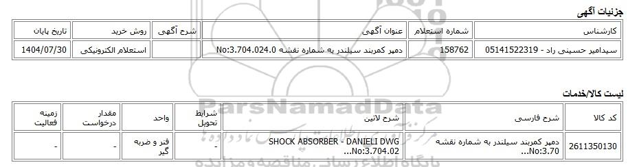 سیدامیر حسینی راد - 05141522319158762دمپر کمربند سیلندر به شماره نقشه No:3.704.024.0استعلام الکترونیکی1404/07/30