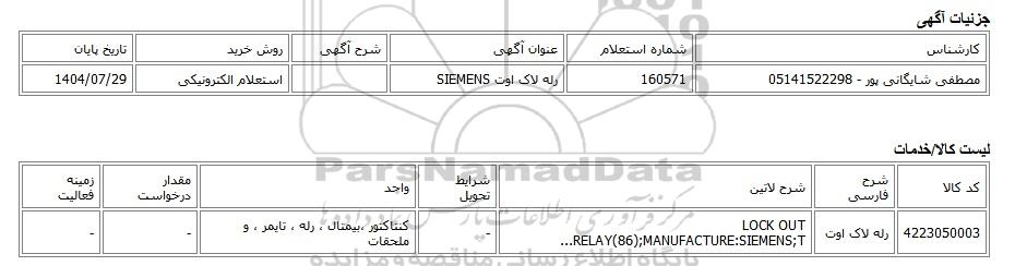 | مصطفی شایگانی پور - 05141522298 | 160571 | رله لاک اوت SIEMENS | استعلام الکترونیکی | 1404/07/29 |