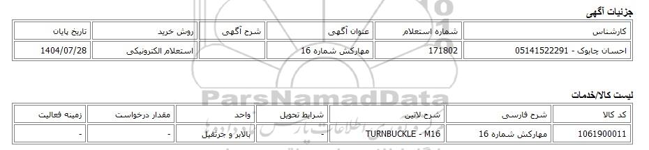 احسان چابوک - 05141522291 | 171802 | مهارکش شماره 16 | استعلام الکترونیکی | 1404/07/28 |