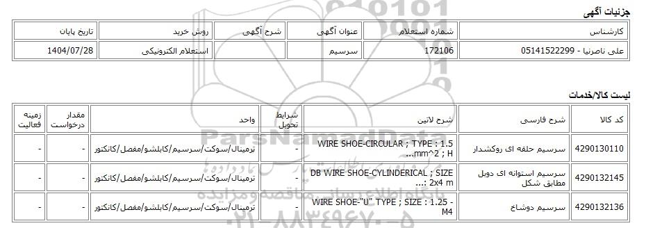 علی ناصرنیا - 05141522299 | 172106 | سرسیم | استعلام الکترونیکی | 1404/07/28 |