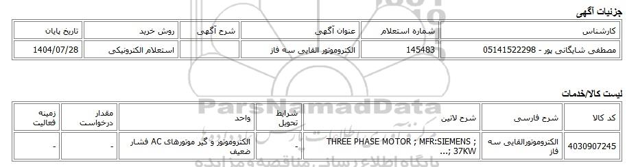 مصطفی شایگانی پور - 05141522298 | 145483 | الکتروموتور القایی سه فاز | استعلام الکترونیکی | 1404/07/28 |