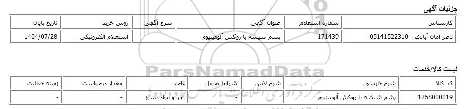 ناصر امان آبادی - 05141522310 | 171439 | پشم شیشه با روکش آلومینیوم | استعلام الکترونیکی | 1404/07/28 |