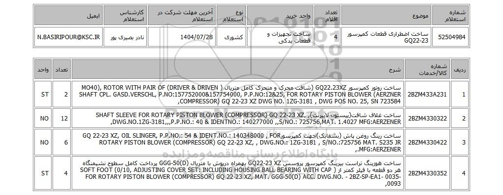 52504984ساخت اضطراری قطعات کمپرسور GQ22-234ساخت تجهیزات و قطعات یدکیکشوری1404/07/28نادر بصیری پورN.BASIRIPOUR@KSC.IR