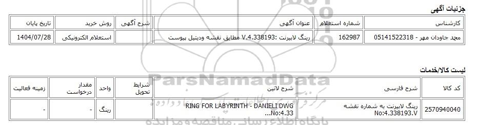 محمد جاودان مهر - 05141522318 | 162987 | رینگ لابیرنت :4.338193.V مطابق نقشه ودیتیل پیوست | استعلام الکترونیکی | 1404/07/28 |