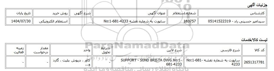 | سیدامیر حسینی راد - 05141522319 | 163757 | ساپورت به شماره نقشه No:1-681-4233 | استعلام الکترونیکی | 1404/07/30 |