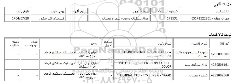 مهران دیوان - 05141522301171532چراغ سیگنال- ریموت- شماره ترمینالاستعلام الکترونیکی1404/07/28