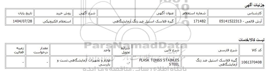 آرش قائمی - 05141522313 | 171482 | گیره فلاسک استیل ضد زنگ آزمایشگاهی | استعلام الکترونیکی | 1404/07/28 |