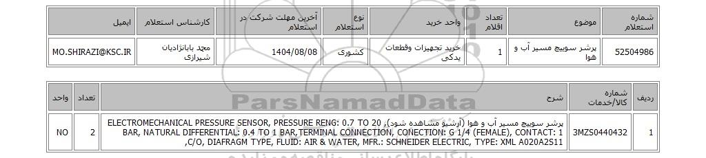 | 52504986 | پرشر سوییچ مسیر آب و هوا | 1 | خرید تجهیزات وقطعات یدکی | کشوری | 1404/08/08 | محمد بابانژادیان شیرازی | MO.SHIRAZI@KSC.IR |