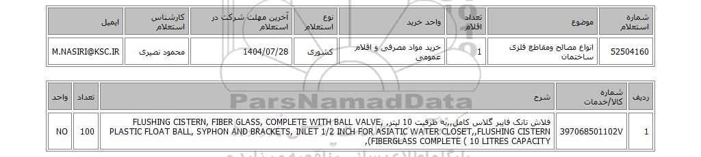 52504160 | انواع مصالح ومقاطع فلزی ساختمان | 1 | خرید مواد مصرفی و اقلام عمومی | کشوری | 1404/07/28 | محمود نصیری | M.NASIRI@KSC.IR |